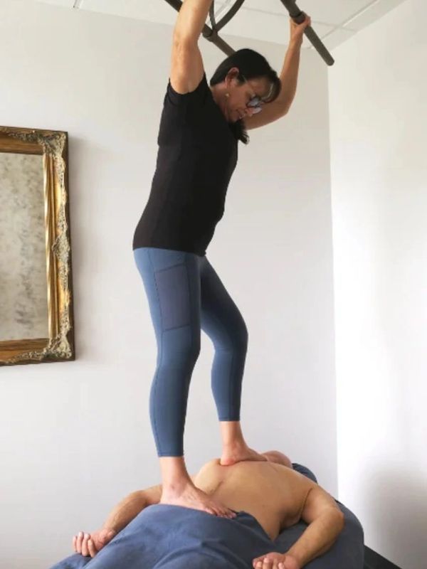 A true deep tissue experience as the therapist uses their feet to apply pressure and stretches while holding onto a bar suspended from the ceiling. Beneficial for applying deep pressure and traction on various parts of the body.